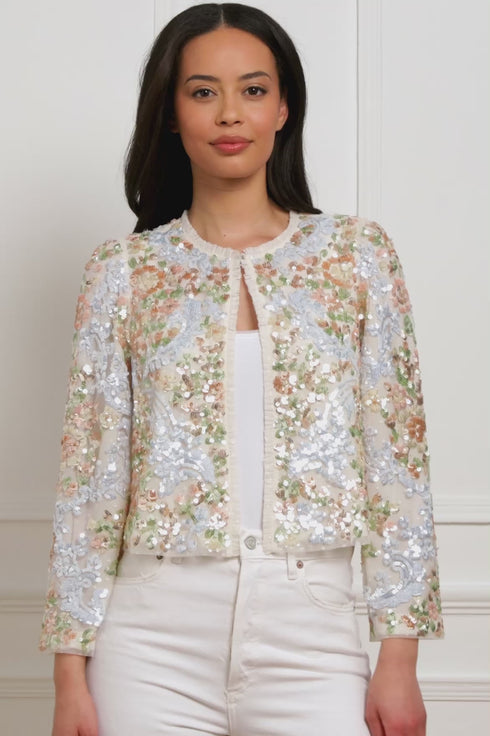 The Baroque Floral Jacket in Cream. A true statement piece, this cropped jacket features intricate floral and scroll embellishments inspired by baroque design. Adorned with multi-coloured sequins finished in a high-shine foil for extra lustre, it shimmers beautifully with every movement. Crafted with slim sleeves and signature Needle & Thread tulle frills at the neckline and edges add a romantic touch, while a silver hook-and-bar fastening completes the look. Perfect for adding drama and elegance to any outfit.