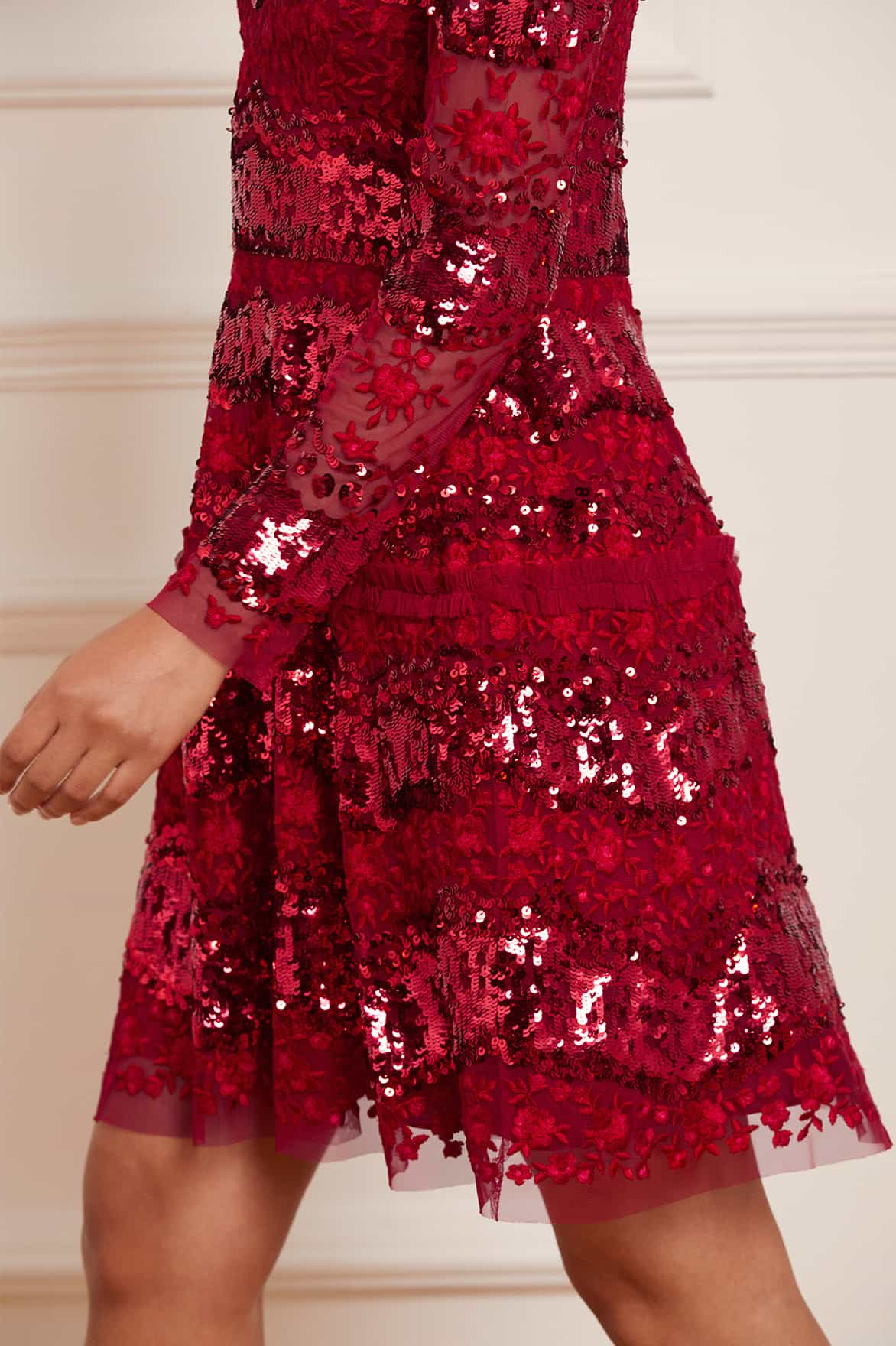 The Chantilly Sequin Micro Mini Dress in Deep Red. A signature silhouette for Needle & Thread, featuring double layers of net to hold this elegant shape for the most flattering look. The artwork is inspired by 1930s styling, featuring floral embroidery in rich tonal shades and high impact sequin stripes. Make time to shine in the Chantilly
