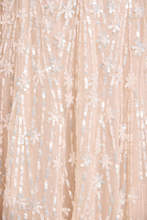 NEEDLE & THREAD EXCLUSIVE. The Comet Ankle Gown in Cream. This beautiful statement piece showcases glittering sequin shooting star motifs, inspired by the night sky, with embellishments that delicately trail down to the hem. This gown features our new floor-length cape, adding an element of romantic elegance. The skirt is crafted from layers of net and tulle, creating a full, voluminous silhouette. The sequins have a special high-shine, gloss finish created from extra foil coating added to each sequin to create this extra lustrous look. Make a memorable appearance in the Comet Ankle Gown.