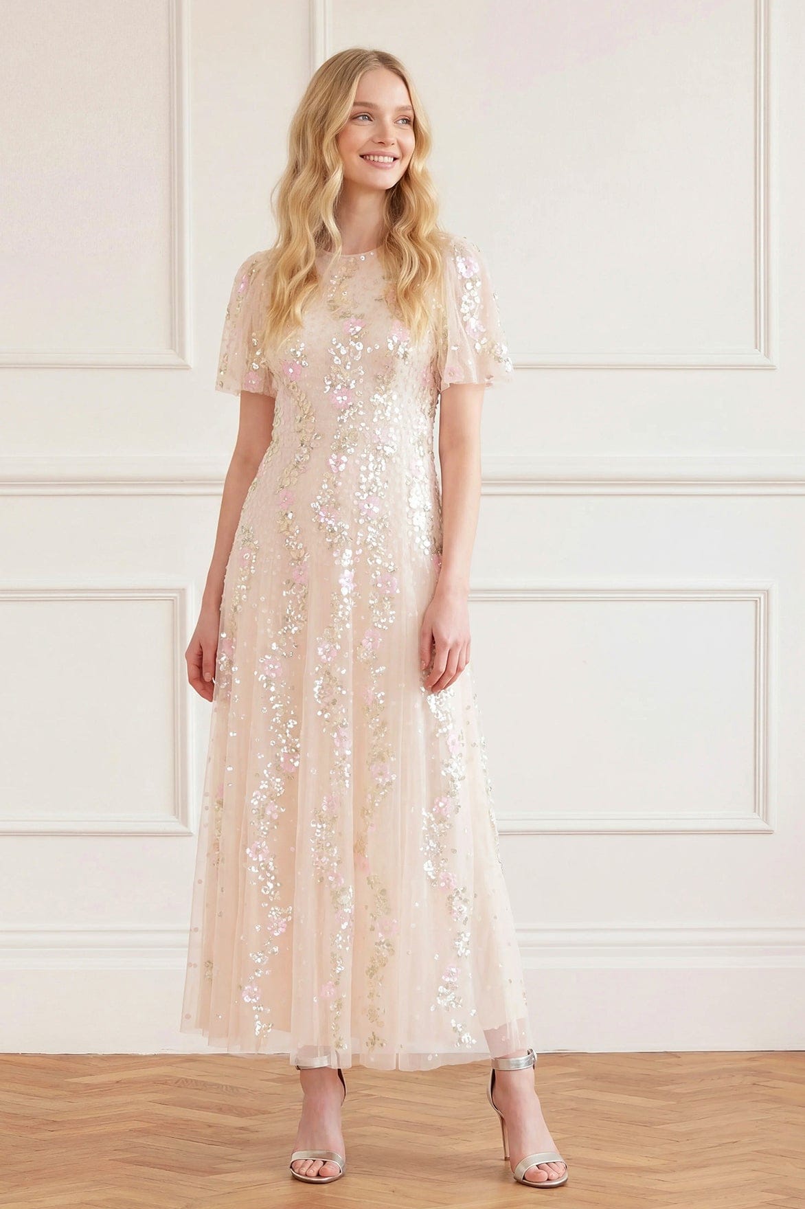 NEW SEASON. The Confetti Round Neck Ankle Gown in Cream/Multi. Beautifully embellished with scattered floral sequins inspired by falling petals, this gown creates a romantic, light-catching finish. The round neckline and flowing ankle-length silhouette offer timeless elegance for occasion dressing.