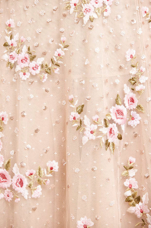 NEW SEASON. The Crescent Roses Cape Ankle Gown in Oyster/Multi. Inspired by constellations and floral crescents, this gown is a dramatic statement of elegance. Featuring cape sleeves with invisible mesh and signature frill detailing, this piece is richly embroidered with crescent roses and shimmering sequins. A poetic and powerful gown for modern romantics.