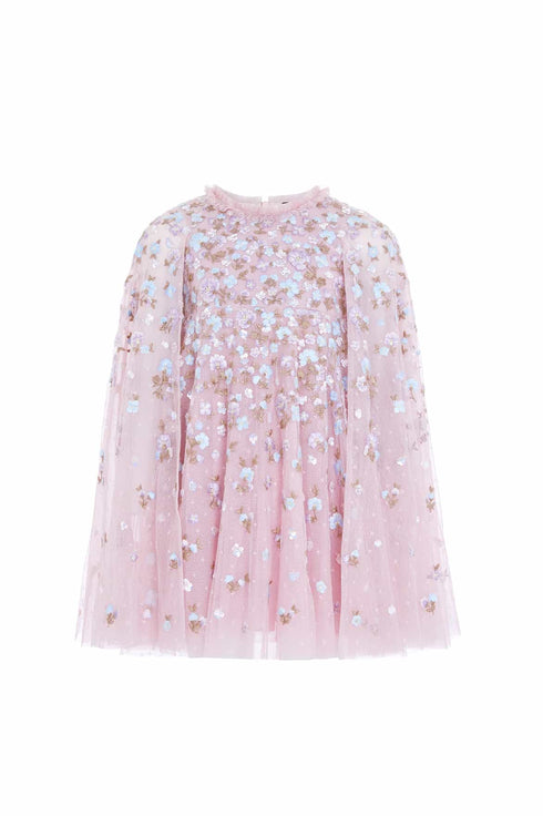 The Dahlia Ditsy Cape Kids Dress in Misty Lilac. This enchanting dress features shimmering sequin dots and delicate floral embroidery. A soft tulle cape, adorned with floral motifs, adds a whimsical touch. With layers of net and tulle for a twirl-worthy skirt, it’s the perfect fairytale dress for your little one’s special occasions.