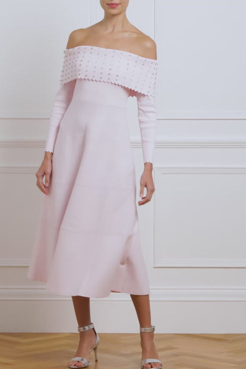 The Embellished Bardot Knit Gown in Pink. This knitted gown is developed from a recycled viscose blend, with stretch yarn for a beautiful, flattering texture. It features a fitted stretch bodice, a feminine bardot neckline, slim sleeves, and scalloped trim details for a romantic look. The bardot neck is beautifully adorned with crystal gems in a linear pattern for a signature Needle & Thread feminine touch.