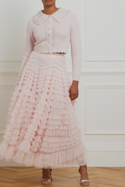 The Embellished Collar Short Cardigan in Peony Pink. This embellished cardigan is developed from alpaca yarn, creating a soft, fluffy texture. Designed with a short silhouette, slim fit sleeves and signature Needle & Thread scallop detailing on the cuff and hem. This pretty style is beautifully crafted with diamante jewel buttons, a bib-neck collar and framed with crystal gems for a feminine look. This elegant style is a new season favourite.