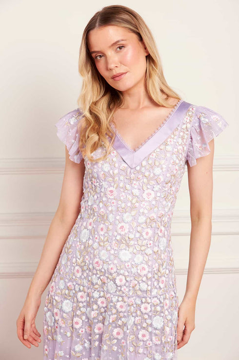 NEW SEASON. The Ethereal Blooms Short Sleeve Ankle Gown in Lavender/Multi. Features intricate trailing floral embroidery in soft pastel tones. Designed with short sleeves and a graceful A-line silhouette, this gown captures romantic movement and ethereal beauty with a subtle shimmer throughout.