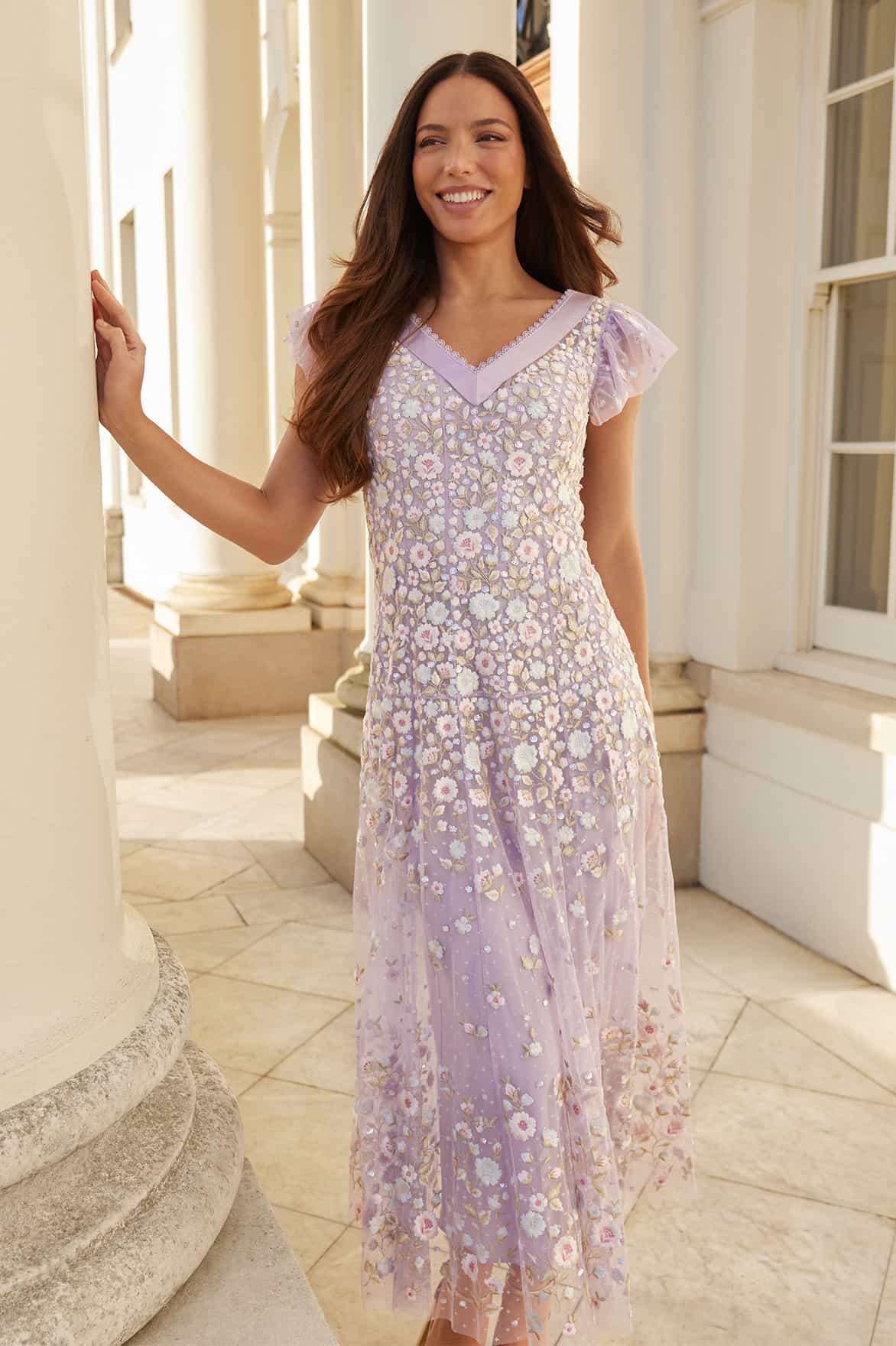 NEW SEASON. The Ethereal Blooms Short Sleeve Ankle Gown in Lavender/Multi. Features intricate trailing floral embroidery in soft pastel tones. Designed with short sleeves and a graceful A-line silhouette, this gown captures romantic movement and ethereal beauty with a subtle shimmer throughout.
