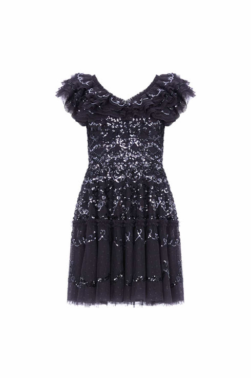 The Everthine Micro Mini Dress in Graphite. This dress is inspired by the hand-scripted love letters of Beethoven, featuring the words 'ever thine ever mine ever ours' on a delicate border. Beautifully designed with intricate sequin artwork developed from the smallest sequin to capture the exquisite detailing. Designed with a vintage, couture-style neckline and adorned with layers of soft tulle and net to create a voluminous, show-stopping skirt shape. This romantic dress will be a piece you'll forever treasure.