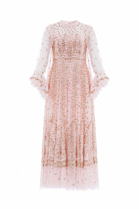 The Fern Ankle Gown in Dusk Pink/Caramel. Inspired by a historical archive artwork, this gown features a shimmering statement sequin border on the skirt hem with a trailing glittering motif design that disperses towards the dress. Crafted in soft tulle with signature Needle & Thread frills, this luxurious style boasts voluminous sleeves with embellished motifs and romantic frills at the cuffs, adorned with glistening sequins. The sequins have a special high-shine gloss finish created by extra foil coating. The skirt is generously made up of layers of soft, delicate tulle and net. A classic and contemporary style.
