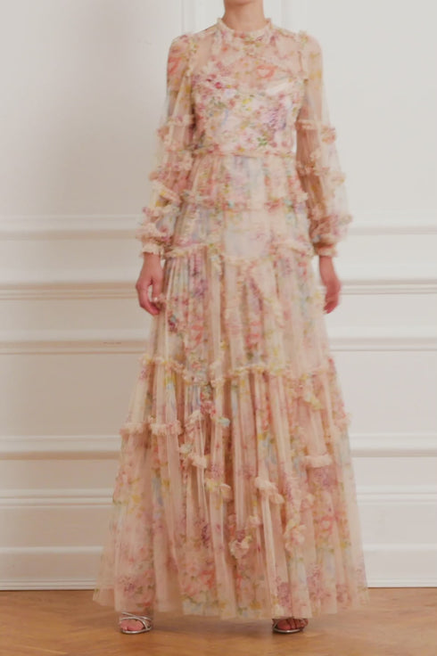 NEW SEASON. Floral Diamond Ruffle Gown in Topaz Pink. This eye catching piece is crafted from delicate ruffled tulle with an all over vintage print taken from an early 1900's hand painted fabric design. A romantic look featuring voluminous cuffed sleeves and a flattering skirt that skims the body to gently increase in fullness, creating stunning movement within the tulle. This Victorian inspired look with a contemporary edge will be the star of your wardrobe.