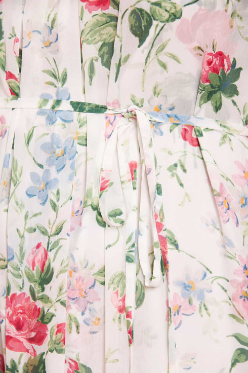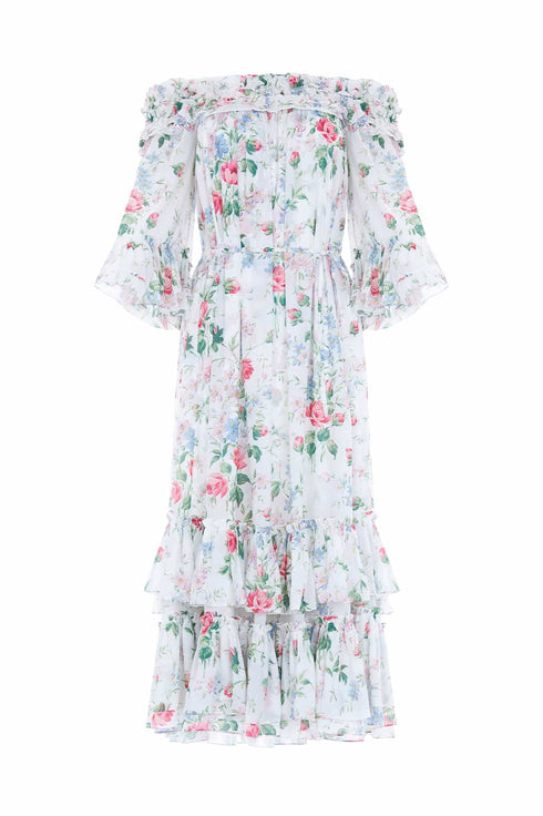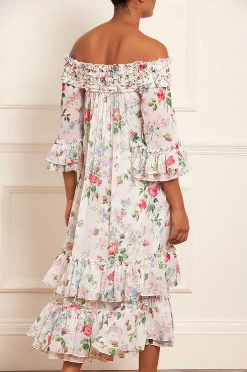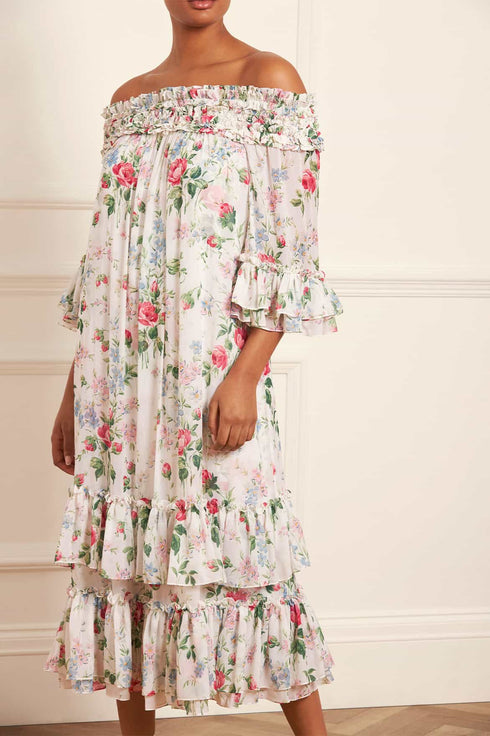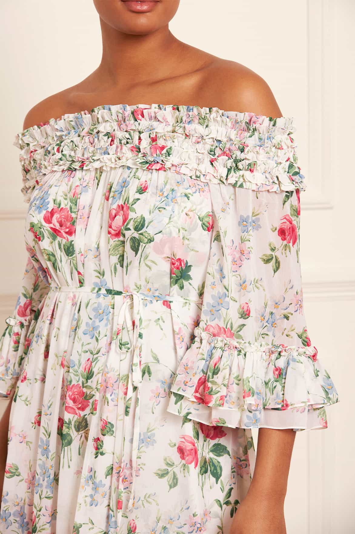 The Floral Fantasy Chiffon Off-Shoulder Ankle Gown in Moonshine. Designed with a beautiful floral print taken from an early 1900’s hand-painted wallpaper design. Decorated with romantic garden florals that create an all-over, organic layout in a whimsical flower artwork. This gown is developed from soft semi-sheer chiffon, creating an effortless, flowing style. Featuring an off-shoulder design and signature layered frills for a romantic edge. Designed with a generous voluminous sleeves to create a statement look. This style has a self-fabric belt for versatile styling.