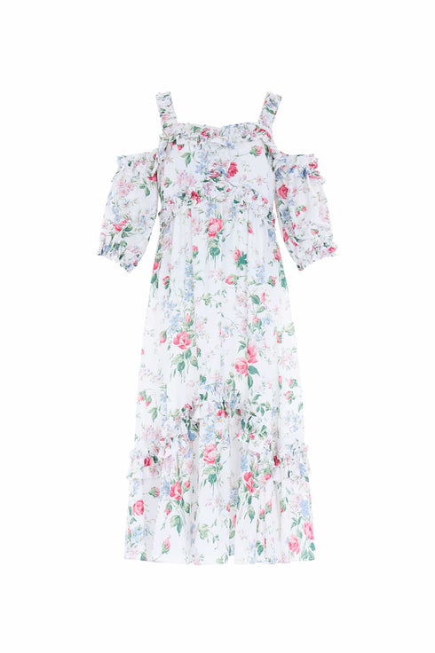 The Floral Fantasy Crepe Off-Shoulder Ballerina Dress in Moonshine. Designed with a beautiful floral print taken from an early 1900’s hand-painted wallpaper design. Decorated with romantic garden florals that create an all-over, organic layout in a whimsical flower artwork. Designed with a contemporary cold-shoulder detail and signature frills adorning the sleeves and bodice adding a romantic edge. Crafted with a loose-fit silhouette for an effortless, whimsical look. A transitional day to night piece.