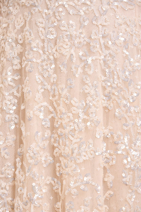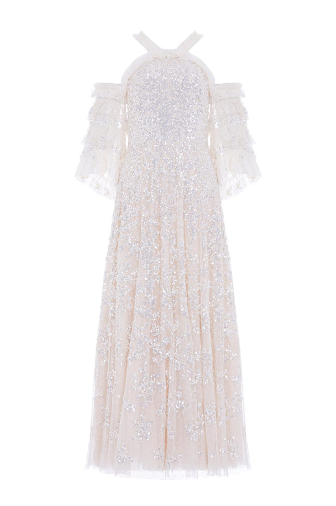 The Floral Lace Off-Shoulder Ankle Gown in Cream. This beautiful dress is embellished with tiny sequins in an overlapping linear formation depicting an exquisite floral design inspired by vintage lace from the early 1900s. The statement off-the-shoulder design has a flattering curved neckline and straps, adorned with signature Needle & Thread soft tulle ruffles. The fluted sleeves are decorated in frothy tulle ruffles and adorned with glittering sequins in floral motifs. The skirt is made up of generous layers of net and tulle with sweeping hemline. The perfect statement style for a special occasion.
