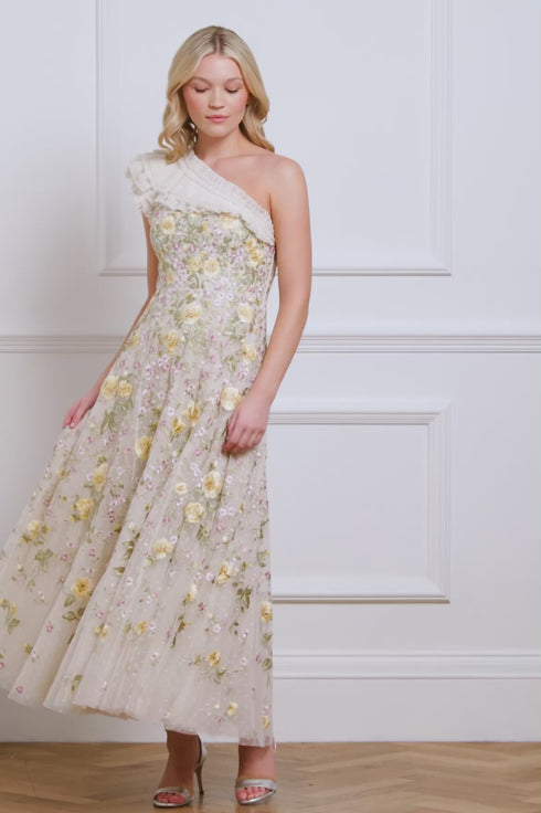 The Florine One-Shoulder Ankle Gown in Cream features luxurious embroidery inspired by a hand-painted archive print from the 1900s, showcasing rose blooms and delicate trailing florals. The one-shoulder design is enhanced with soft tulle ruffles, adding a romantic touch and signature Needle & Thread styling. The skirt is crafted from layers of soft tulle, creating an elegant, romantic look. Make an entrance at your next event.