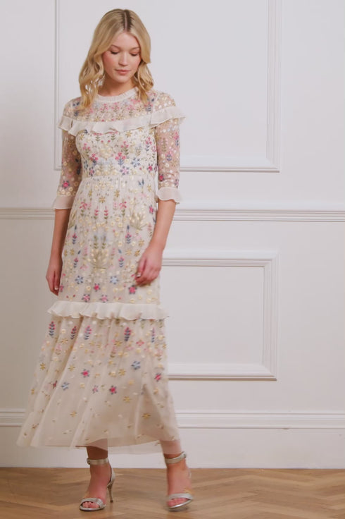 The Flowerbed Embroidery Ankle Gown in Cream is a pretty, heritage Needle & Thread design. It showcases multi-coloured floral embroidery, with shimmering sequins scattered towards the hem for a captivating effect. Crafted from soft chiffon, delicate frills adorn the yoke, cuffs, and skirt, enhancing its romantic charm. The gathered skirt creates a flattering, graceful silhouette. A timeless and elegant gown, perfect for any occasion.