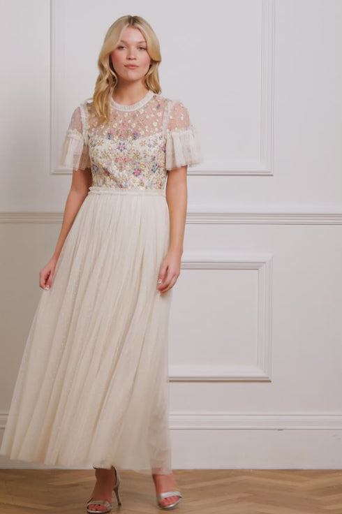 The Flowerbed Embroidery Bodice Round Neck Ankle Gown in Cream/ Moonshine is a pretty gown featuring intricate floral embroidery on the bodice, inspired by antique lace. The round neckline is elegantly trimmed with signature Needle & Thread tulle at the neckline, waist, and shoulders for a romantic touch. Developed with fluted sleeves, crafted from layers of tulle frills and delicate floral motifs, add a refined finish. The soft tulle skirt drapes beautifully, creating a graceful, romantic silhouette. A perfect combination of classic and contemporary style for any special occasion.