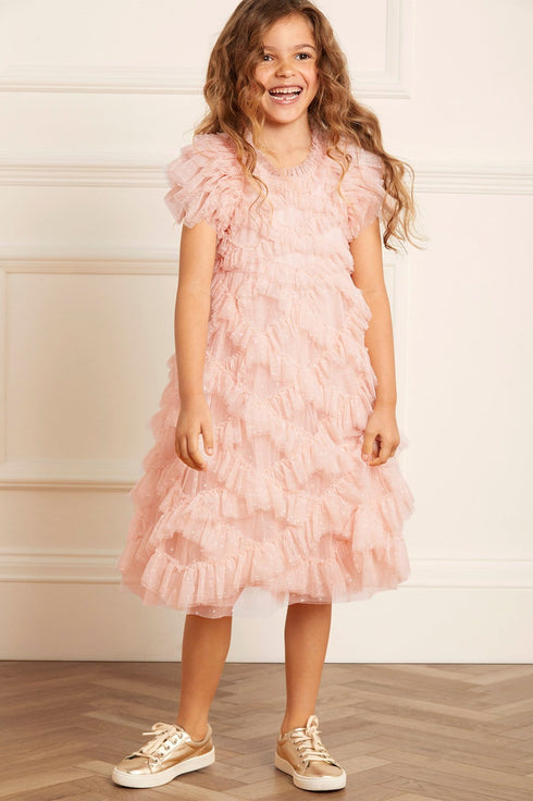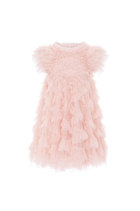 NEW SEASON | The Genevieve KIDS Dress in Petal Pink. This frothy textured dress is designed with playfully dramatic sleeves to create frilly fullness at the shoulders. It also features diamond stitch detailing resulting in a beautifully textile finish. Let your little one take centre stage in this statement piece.