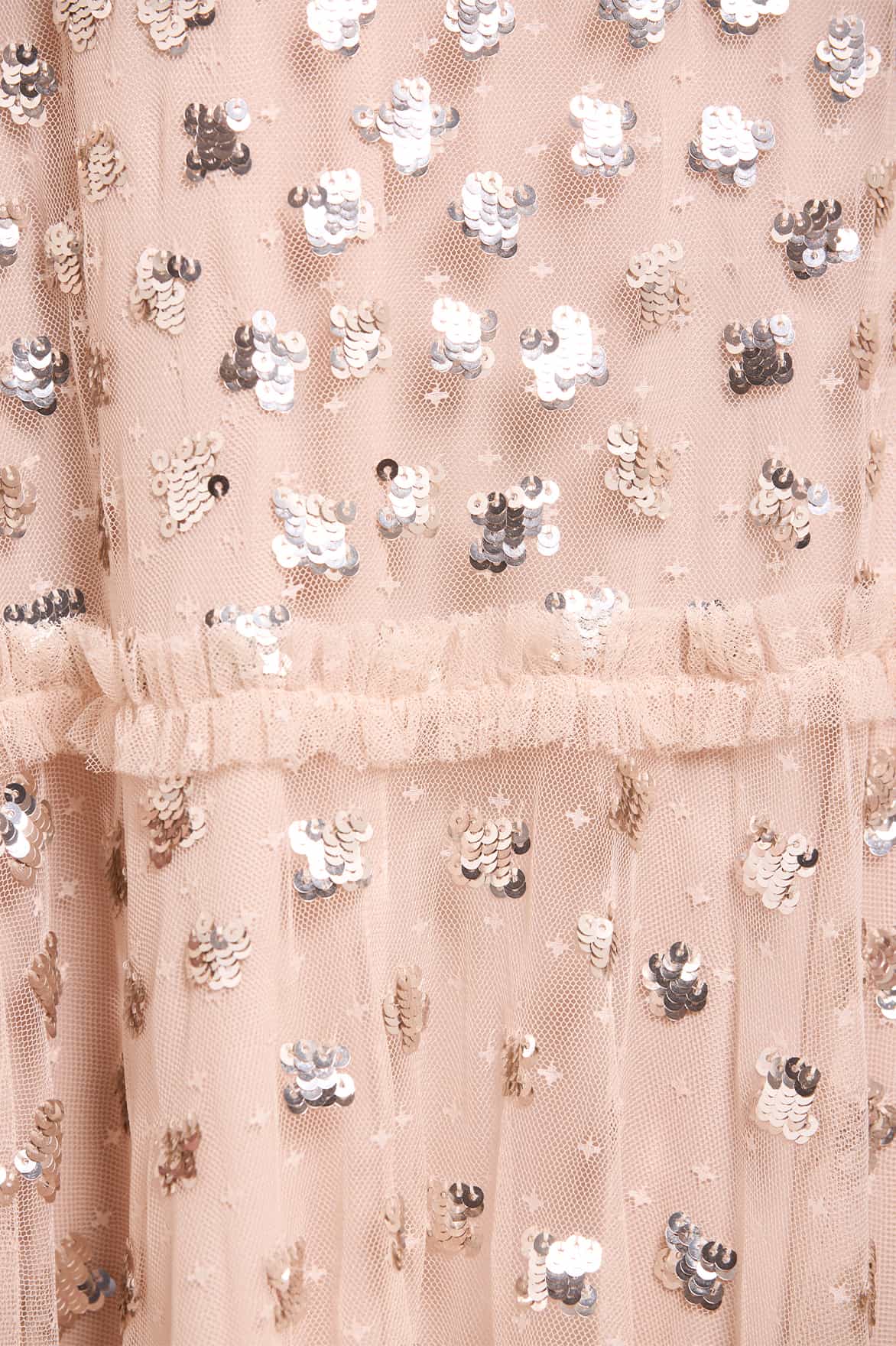 The Glisten Tiered Ankle Gown in Dust Beige / Silver. Beautifully adorned with shimmering sequin motifs that scatter towards the hem, this ethereal style features a loose, flattering fit and flowing shape for ease of wear. Designed with romantic fluted bracelet-length sleeves with frill cuffs decorated with scattered sequin motifs. The skirt is developed from layers of signature Needle & Thread soft tulle for a touch of romantic styling.