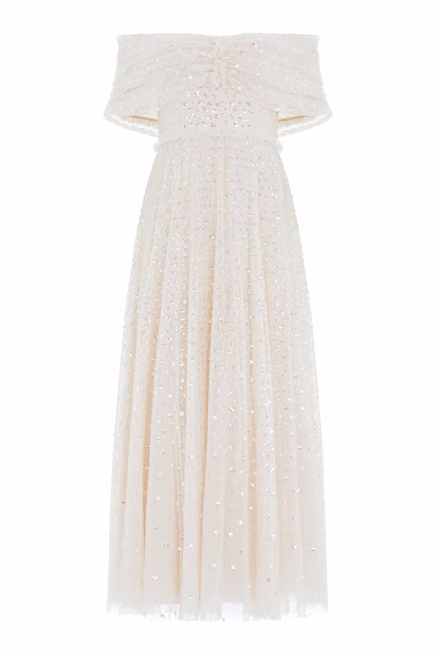 The Grace Gloss Off-Shoulder Ankle Gown in Cream / Silver. This gown is beautifully decorated with high-shine sequins in dot motifs creating an enchanting, shimmery effect. Crafted with an off-the-shoulder design inspired by iconic Grace Kelly, capturing the elegance of her look perfectly. Designed with an integrated corset for the perfect shape and structure. You'll forever treasure the Grace Gloss.