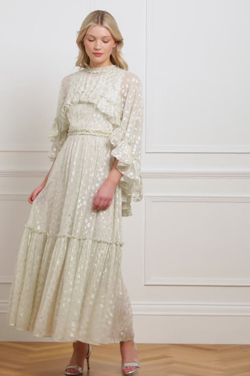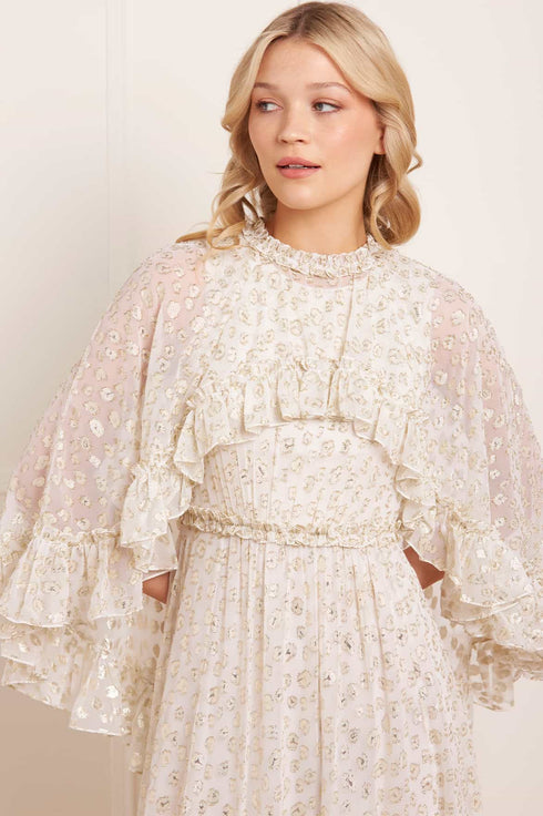 The Harper Lurex Cape Ankle Gown in Cream. Crafted in luxurious glittering gold lurex georgette fabric, this gown features a delicate, subtle leopard print motif that adds an understated touch of drama. The dramatic cape, with a detachable fastening, offers versatile styling options, while the soft chiffon creates a romantic, flowing silhouette. Perfect for transitioning seamlessly from day to night.