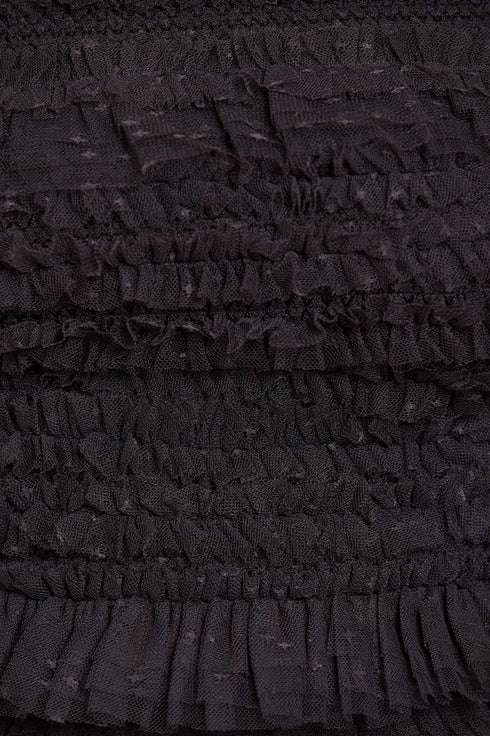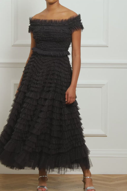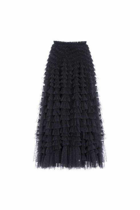 The Hattie Ruffle Skirt in Graphite. This textile skirt is engineered with layers of soft tulle and net to create a signature Needle & Thread style. Crafted with individual ruffles to create a beautiful, frilly texture. Designed with a sweeping hemline and finished at the waist with a satin ribbon for extra detail. We recommend pairing this skirt with our knitwear for a romantic Needle & Thread look.