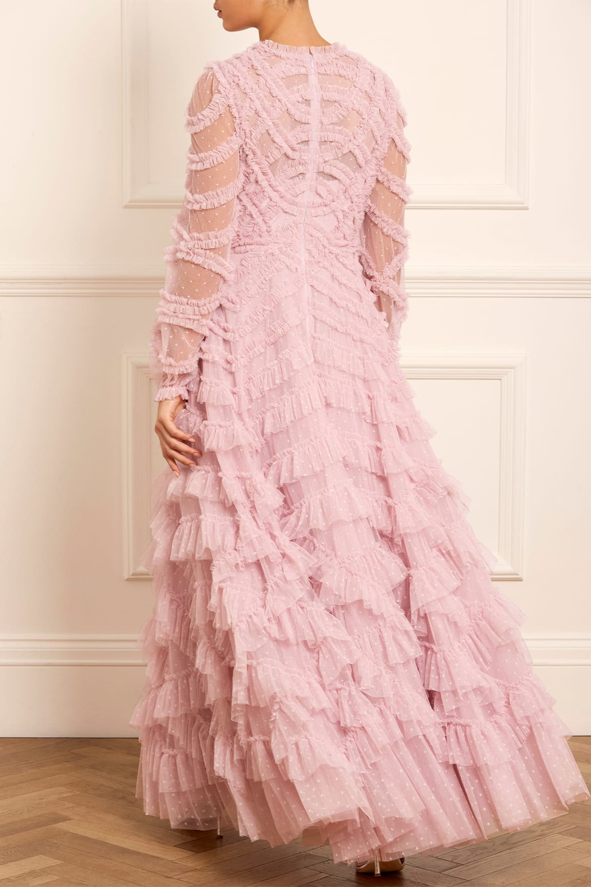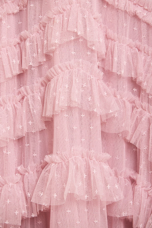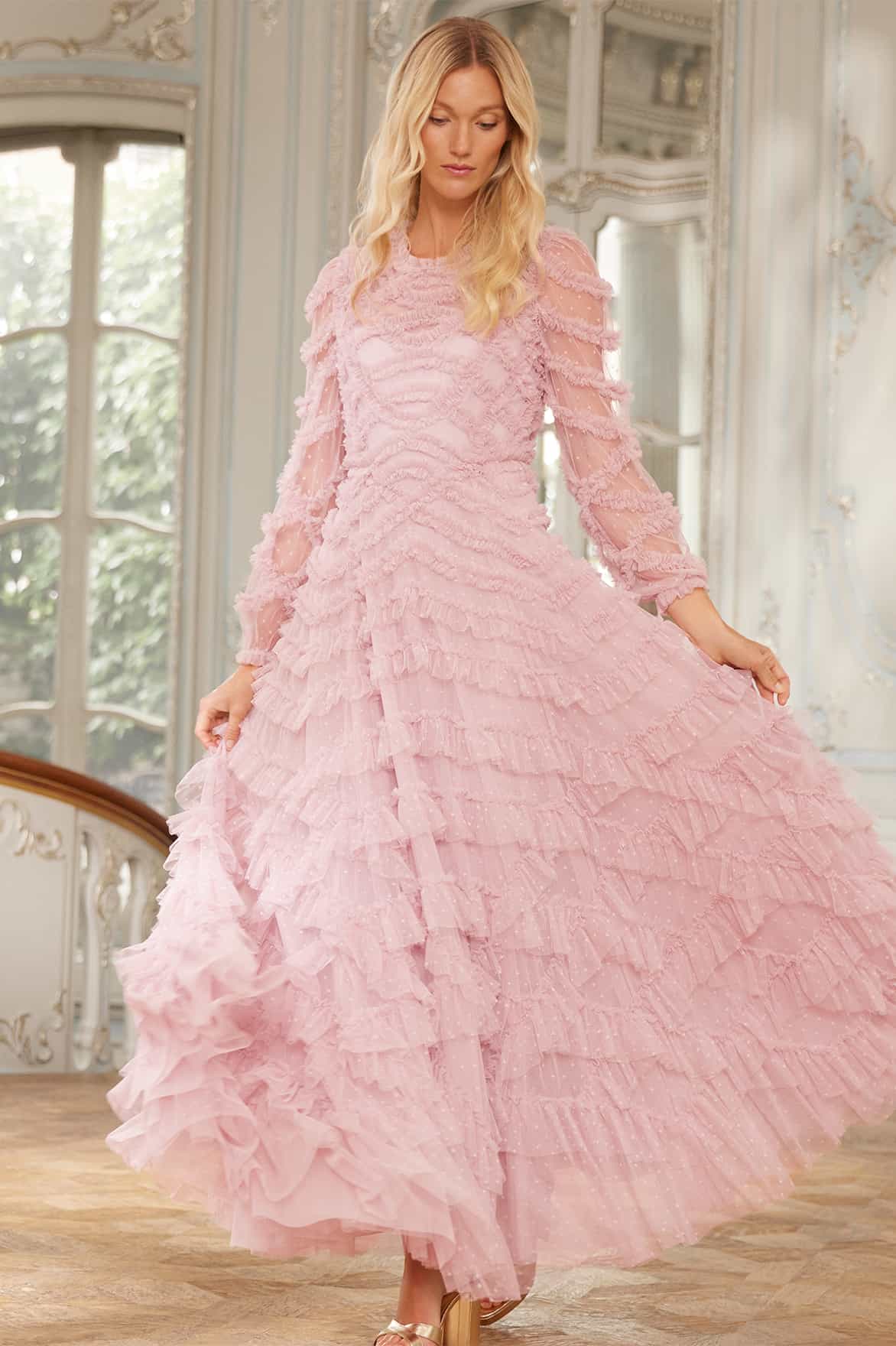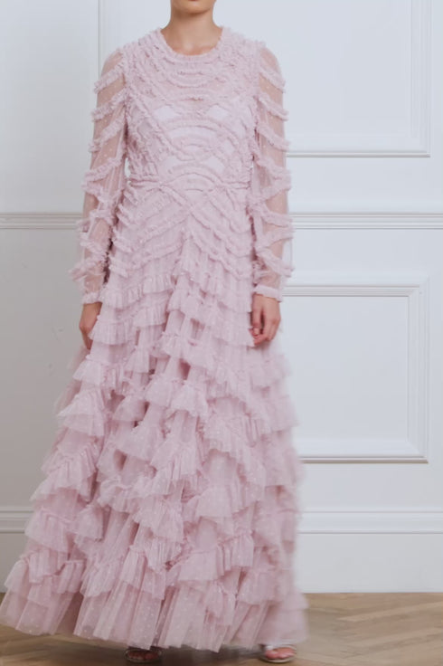 The Lana Round Neck Gown in Misty Lilac. This beautiful gown is adorned with engineered tulle frills to create a romantic textile. Developed with a round neckline and long sleeves for an elegant look. Beautifully crafted with layers of soft tulle for a whimsical, statement texture. Expect all eyes on you in this magical Needle & Thread piece.