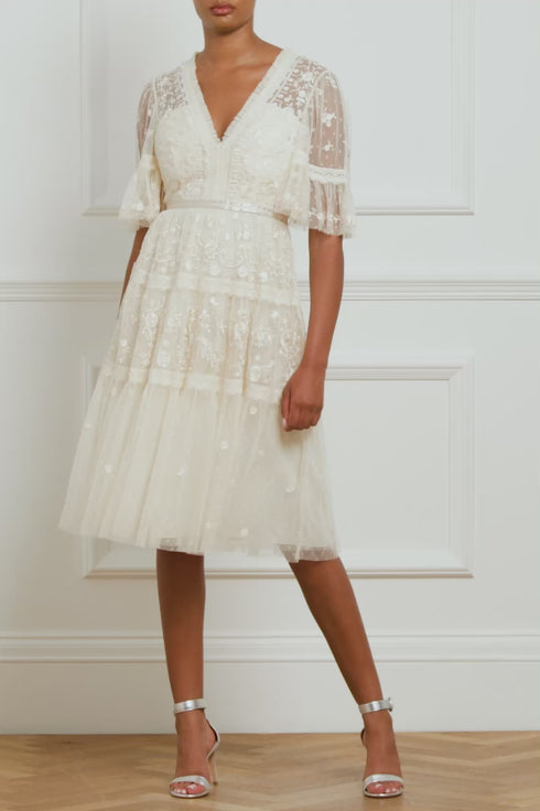 The Lottie Lace Midi Dress in Champagne. A signature Needle & Thread style, updated for the new season ahead. Taking inspiration from Victorian lace, the Lottie features intricately embroidered artwork in a tonal thread featured on delicate tulle. Lace trims border the neckline and frame each tier of the skirt. This embroidered lace dress has sheer, romantic sleeves and our signature grosgrain ribbon at the waist. The perfect dress to take you from day to night.
