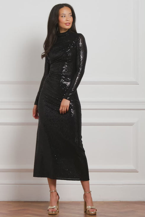 NEW SEASON. The Malia Turtleneck Ankle Gown in Graphite. A sleek silhouette defined by its high neckline and long sleeves evokes Victorian modesty, while the fluid skirt recalls night skies in motion. The graphite palette lends sophistication and drama, creating a gown for evenings steeped in romance.