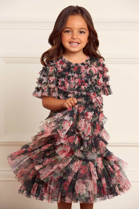 The Midnight Dance Marilla Ruffle Kids Dress in Graphite. This dress is beautifully printed with a decadent floral print featuring luxurious blooms taken from archive, hand painted artwork from the early 1900’s. Crafted with signature Needle & Thread detailing, the dress showcases delicate tulle ruffles and frills, creating a playful, frothy texture throughout. It features short, fluted sleeves trimmed with softly gathered frills. This dress will transport them to a Winter Wonderland.