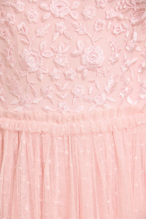 The Midsummer Lace Bodice Off-Shoulder Ankle Gown in Dusk Pink. This gown is an update of our bestselling signature style. Beautifully developed with layers of soft, delicate tulle and an off-the-shoulder shape to create a romantic silhouette. The bodice is scattered with vintage-inspired embroidered motifs for a signature Needle & Thread look. The perfect style for a bridesmaid or special event.