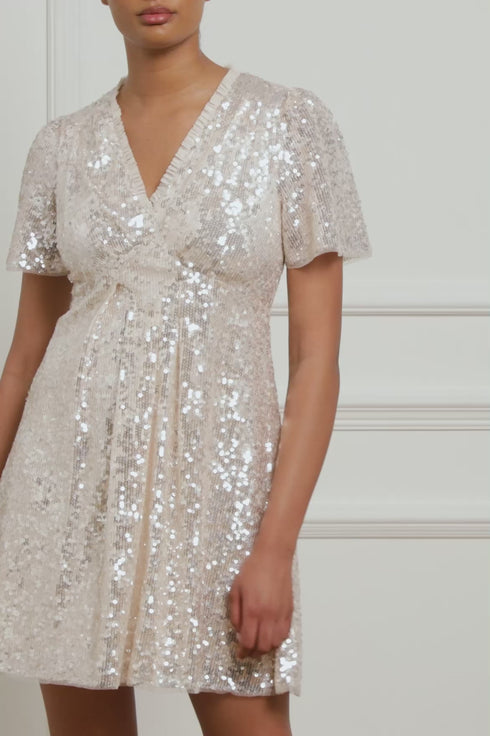 The Mila Gloss Mini Dress in Cream. This magical piece is designed with specially sourced gloss sequins creating an extra sparkle effect. Developed with perfectly placed panels and pleats to create an effortlessly, flattering silhouette inspired by a 1930's tea dress. Make a striking appearance in the Mila.