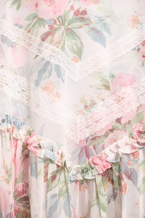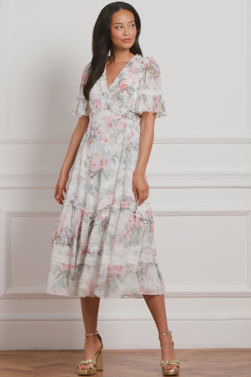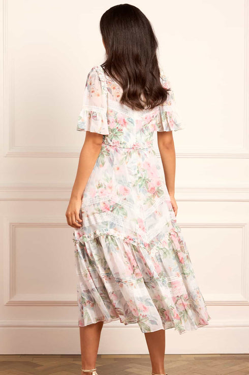 The Paradise Garden Sonata Georgette Ballerina Dress in Moonshine. The print of this dress is inspired by an enchanting paradise garden print, taken from an 1900s hand-painted artwork. This dress is designed with a luxe, twilight inspired colour palette in rich, lush floral motifs to create a truly alluring print. Developed in our soft, georgette fabric creating a flowing silhouette. Designed with Victorian inspired garments featuring a lace insert detailing and panelling. A transitional day to night piece.