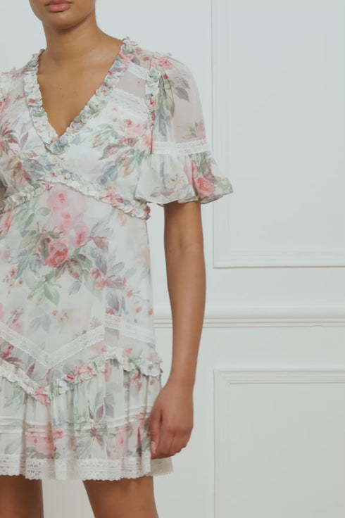 The Paradise Garden Sonata Georgette Micro Mini Dress in Moonshine. The print of this dress is inspired by an enchanting paradise garden print, taken from an 1900s hand-painted artwork. This dress is designed with a luxe, twilight inspired colour palette in rich, lush floral motifs to create a truly alluring print. Developed in our soft, georgette fabric creating a flowing silhouette. Designed with Victorian inspired garments featuring a lace insert detailing and panelling. A transitional day to night piece.