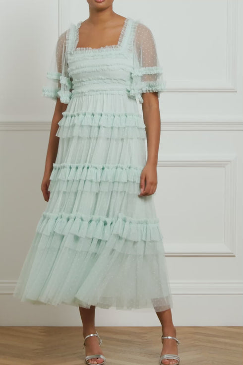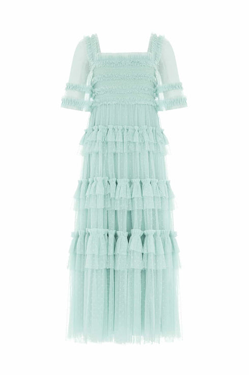 The Peaches Smocked Ankle Gown in Menthol Green. Designed with playful layered tiers and frills, plus a generous full skirt for romantic movement, this ankle gown features an elasticated smocked waist for comfort and pretty detailing. Beautifully crafted with short sleeves, tulle ruffles and an 'x' motif throughout. The perfect dress to take you from day to night.