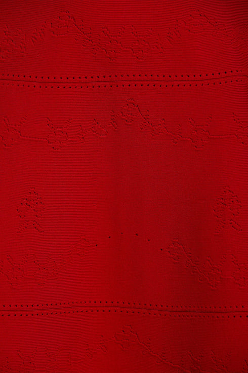 The Pretty Pointelle Knit Ankle Gown in Red. A brand new style for Needle & Thread. This knitted gown is inspired by vintage ditsy florals and lace. Beautifully designed with all-over pretty pointelle stitch, delicate florals and scallop details. This gown has a fitted stretch bodice with a soft, round neckline, fluted cuffs and signature Needle & Thread detailing. A truly flattering piece.