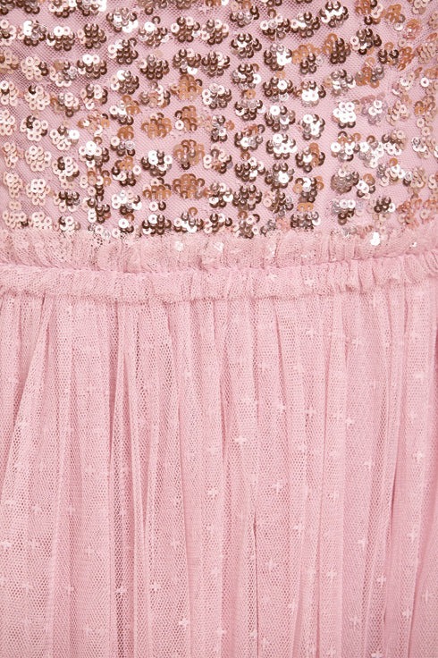 The Raindrop Bodice One Shoulder Ankle Gown in Sunflower. This bodice of this gown is beautifully adorned with an enchanting sequin artwork. The artwork is designed with delicate shimmering polka dot sequins in a linear formation capturing the essence of glistening raindrops. Designed with an off-the-shoulder style for elegant detailing. The skirt is made from layers of frothy tulle featuring statement frill details, creating a signature romantic look. The gown is perfect for a bridesmaid moment or an upcoming special event.