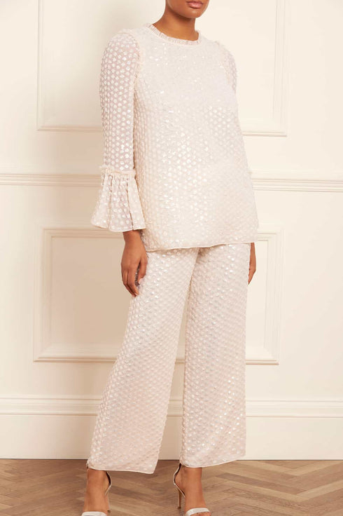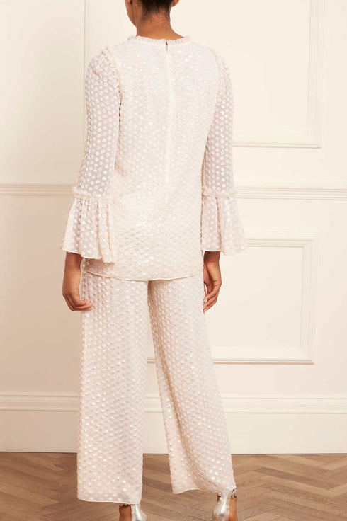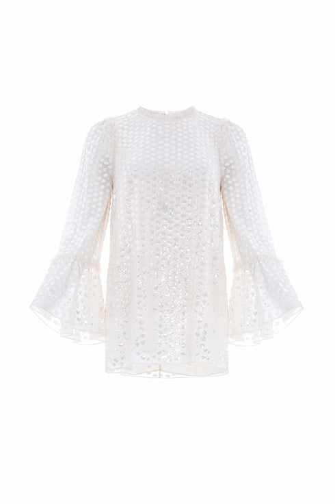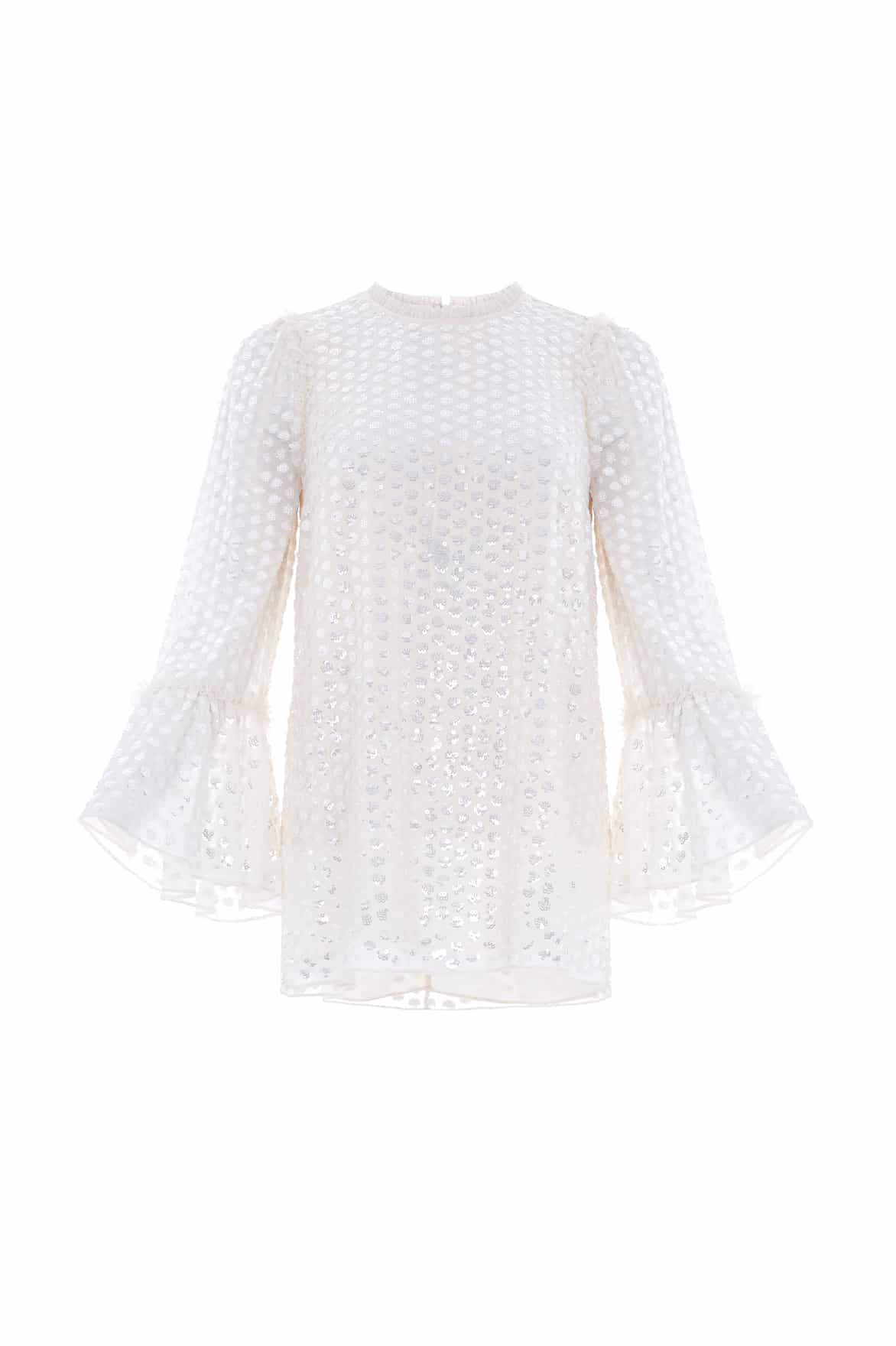 The Raindrop Gloss Tunic in Cream. This top is beautifully adorned with scattered sequins, adding a romantic, shimmering effect. Designed with the most exquisite sequins with an extra foil coating to create an ultra-high shine finish. This relaxed tunic is designed with an easy-wear, loose fit silhouette. Developed with exaggerated cuff details and voluminous, gathered frill for signature Needle & Thread details. Pair with the matching Raindrop Gloss Skirt for the full Needle & Thread look.