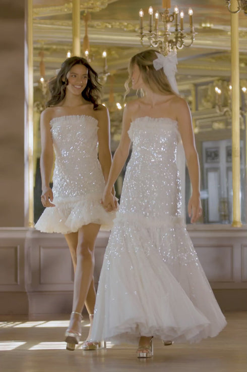The Regal Rose Gloss Strapless Micro Mini Dress in Cream. The Regal Rose is decorated with elegant, floral artwork featuring delicate lace. This dress is developed with a fitted corset bodice and then flows into a dramatic, voluminous skirt. The integrated corset is made with ribbon stitching, soft boning and panels of stretch mesh fabric for comfort and security in the fit. The perfect dress for a special moment.