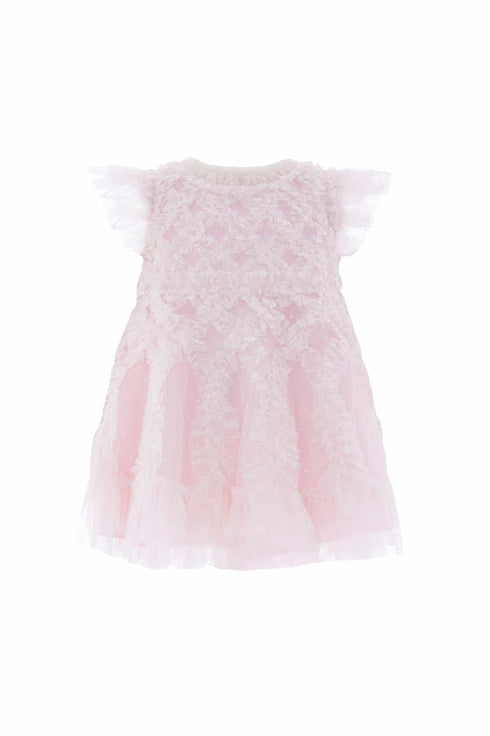 The Rosella Baby Dress in Peony Pink/Cream. This dress features intricate cross-hatch frill detailing on the bodice, cascading into playful scalloped edges at the hem. Designed with contrast-colour frills and signature Needle & Thread touches at the neckline, waist, and shoulders adds whimsical charm. Finished with soft, layered tulle sleeves and fully lined in gentle cotton voile for all-day comfort. Complete with coordinating cotton dobby bloomers, edged in delicate frills. A timeless statement piece your little one will cherish forever.