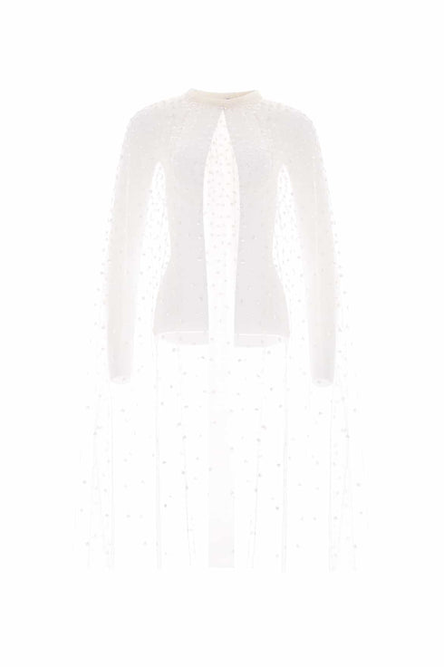 The Sequin Cascade Midaxi Open Cape in Cream. This elegant tulle cape is adorned with shimmering sequin dot motifs that gently scatter toward the hem, creating a soft, luminous effect. Each sequin features a special high-shine foil coating, adding an extra layer of brilliance and depth. Finished with a signature Needle & Thread frill at the neckline and a refined silver metal hook-and-eye fastening, this cape is a timeless accessory designed to elevate any look with grace and sophistication.
