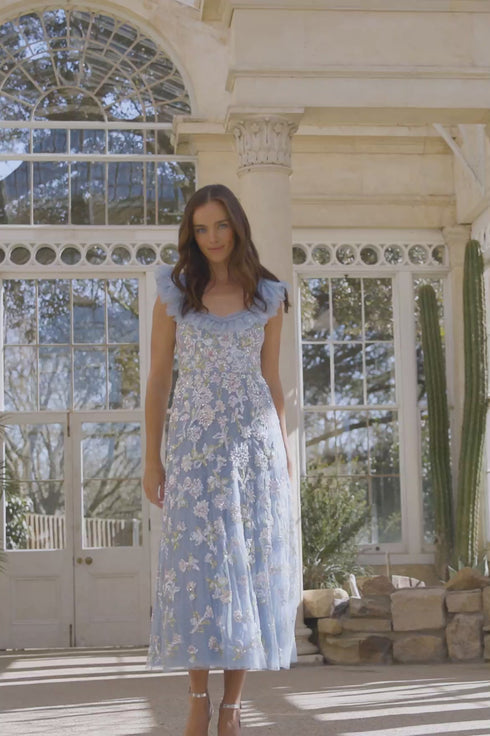 The Sequin Dandelion Ruffle Ballerina Dress in Sky Blue, inspired by Victorian botanical artist Marianne North. This dress features colourful shimmering dandelion floral sequins that scatter towards the hem. The high-shine sequins, coated with foil, add a lustrous finish. The flattering skirt skims the body, gently flaring for beautiful movement. Crafted with frothy tulle frill sleeves and signature Needle & Thread frills at the neckline enhance its romantic, elegant feel.
