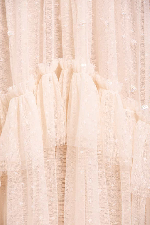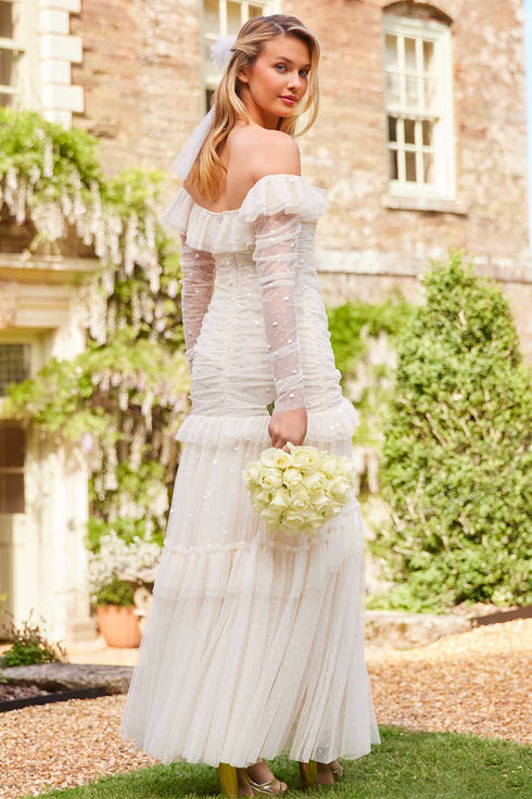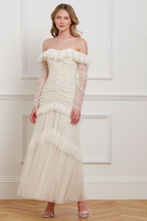 The Sequin Glimmer Rouched Off-Shoulder Gown in Cream. Make an entrance in this show stopping gown, featuring an off-shoulder neckline adorned with cascading circle-cut frills that create a soft, romantic silhouette. Crafted with glittering sequin dot motifs, enhanced with a high-shine foil coating for an ultra-lustrous finish, which gently scatters down the layered tulle skirt, adding ethereal movement. The ruched bodice and sleeves flatter the figure, while the tiered skirt with topstitched gathered frills lends delicate depth and charm. An internal stretch power mesh corset provides structure, comfort, and support, detailed with soft boning encased in grosgrain ribbon and adjustable hook-and-eye fastenings for a refined, couture finish.