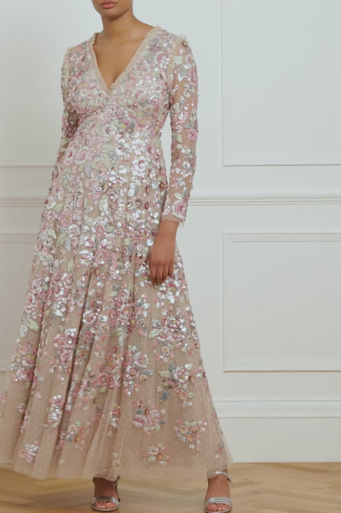 The Sequin Paradise Long Sleeve Gown in Sand. This gown is beautifully embellished with an intricate sequin artwork, inspired by one of our key prints - paradise garden. The sequins are depicted in rich tones of pink and greens creating this enchanting floral artwork. Developed with generous layers of net to create a show-stopping skirt shape. A true Needle & Thread statement piece.