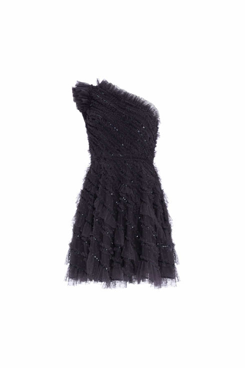 The Spiral Sequin One Shoulder Micro Mini Dress in Graphite. A brand new style for the season ahead. This dress is elegantly crafted with a one shoulder design. Beautifully engineered with gathered, spiral texture and intricate, shimmering sequins adorning each individual frill creating an enchanting effect. Beautifully adorned with delicate tulle frills and a layered tulle skirt for a frothy, romantic texture. We hope you love the spiral sequins as much as we do.