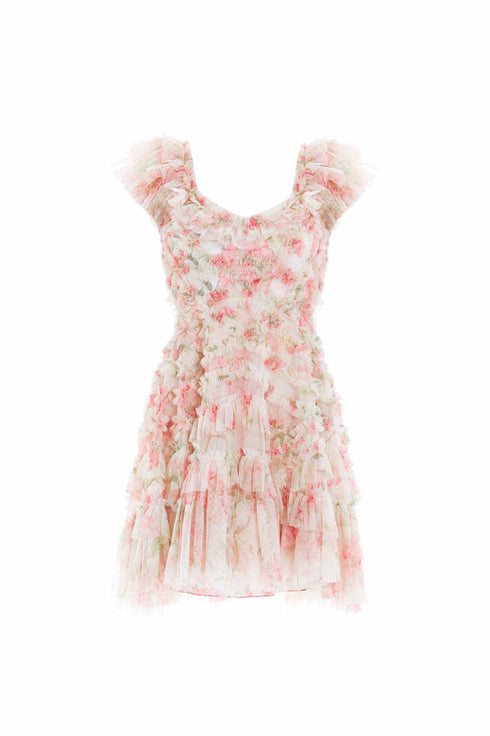 Meet the Summer Posy Lola Backless Micro Mini Dress in Moonshine / Coral. A hand-painted archive print featuring sunset and pink peonies in full bloom. This mini dress is decorated with pretty posy, floral clusters scattered and dispersed throughout to create an all-over beautiful print. Designed with signature Needle & Thread detailing featuring soft tulle, gathered frills and an engineered textile. Developed with a backless design and frothy sleeves for a playful, romantic look. Expect all eyes on you in this whimsical piece.