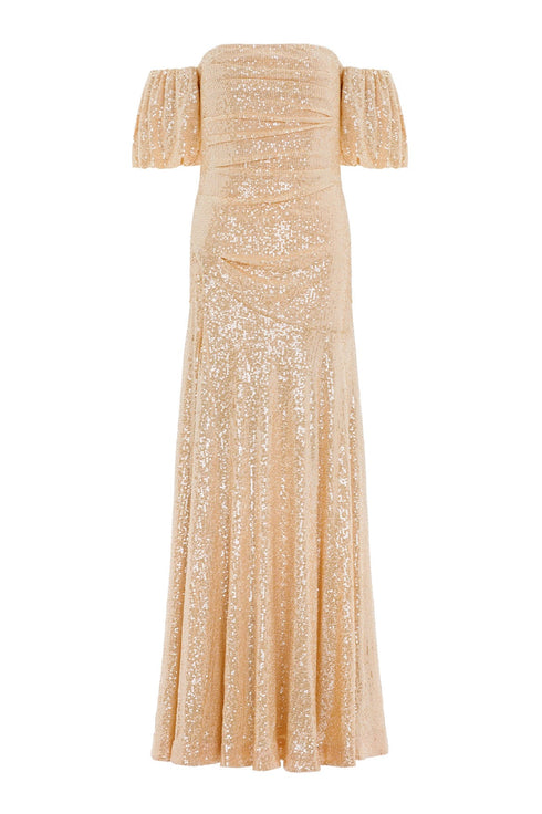 The Sunbeam Valentina Off-Shoulder Gown in Antique Gold. Turn heads in the dazzling gown. Featuring shimmering 3mm sequins on stretch mesh, an off-shoulder silhouette, and a fluid skirt, this design exudes timeless elegance. Crafted with romantic puff sleeves and soft draping flatter the figure, while an internal corset ensures comfort and support. Perfect for glamorous soirées, this gown promises unforgettable sophistication.