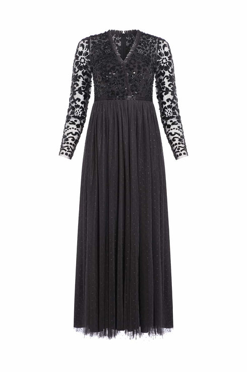 The Tempest V-Neck Bodice Ankle Gown in Graphite. This beautiful gown is inspired by a vintage lace tablecloth design. Its bodice is adorned with sequins, creating an all-over shimmer effect. Crafted with long sleeves, a v-neckline and a tulle multi-layered skirt. Make an entrance in the Tempest.