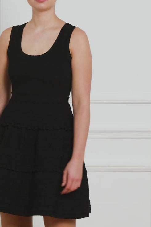 The Textured Knit Sleeveless Mini Dress in Black. This knitted dress is intricately designed with scallop and pointelle trims for signature Needle & Thread detailing. Beautifully developed from a stretch, yarn fabric that makes the dress easy to wear and comfortable. This sleeveless dress is adorned with perfectly placed knitted ruffles, lace cable details and a voluminous skirt. Make this dress your new wardrobe staple.