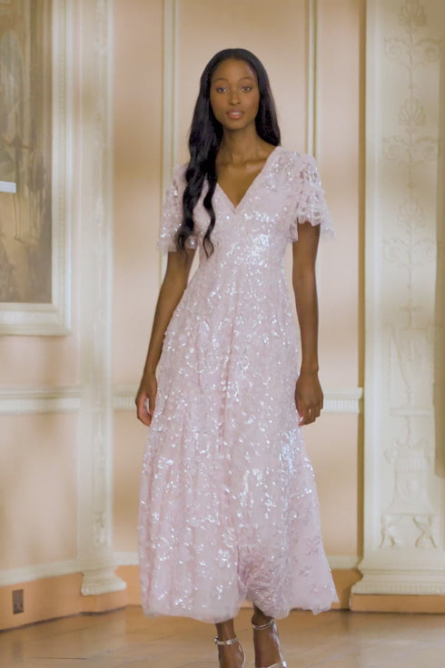 The Trailing Bow Gown in Peony Pink. A true statement piece in the collection. This gown is designed with an intricate artwork and ribbon bows cascading down the gown. Featuring scattered floral and scallop motifs for romantic detailing. Crafted with specially sourced sequins to add extra sparkle, and a generously sweeping hemline made from layers of tulle and net for striking movement. An eye catching piece for a special occasion.