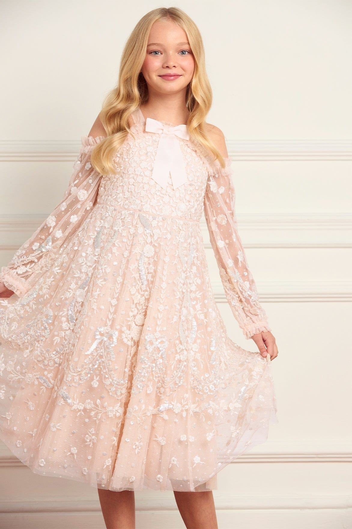 The Adeline Off-Shoulder Kids Dress in Opal/Cream. A soft, elegant piece with signature Needle & Thread charm. Victorian-inspired floral motifs and scalloped embroidery brings whimsical detail to the layered tulle. Perfectly pairs with the women’s Adeline Gown in the same colourway for matching occasionwear.