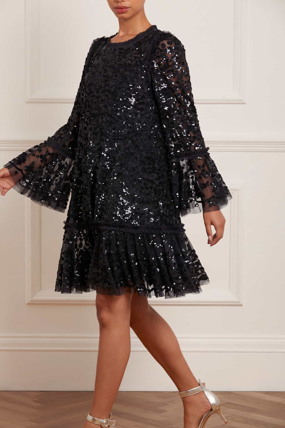 The Annie Sequin Tiered Mini Dress in Graphite. This mini dress is adorned with shimmering sequins in floral and bow artwork inspired by a lace tablecloth. Designed with a loose fit silhouette and tiered throughout, creating beautiful movement. Make an effortless statement in the Annie.